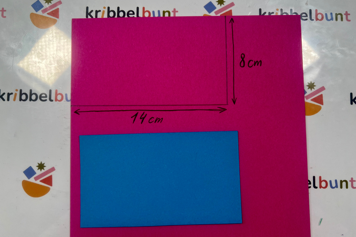- Schneidet aus eurem bunten Tonpapier ein Rechteck in den Maßen 14 cm x 8 cm aus. Das wird die äußere Hülle von eurem Notizheft.