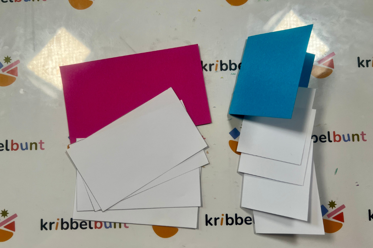 - Eure Rechtecke - bunt und weiß - faltet ihr nun in der Mitte zusammen.