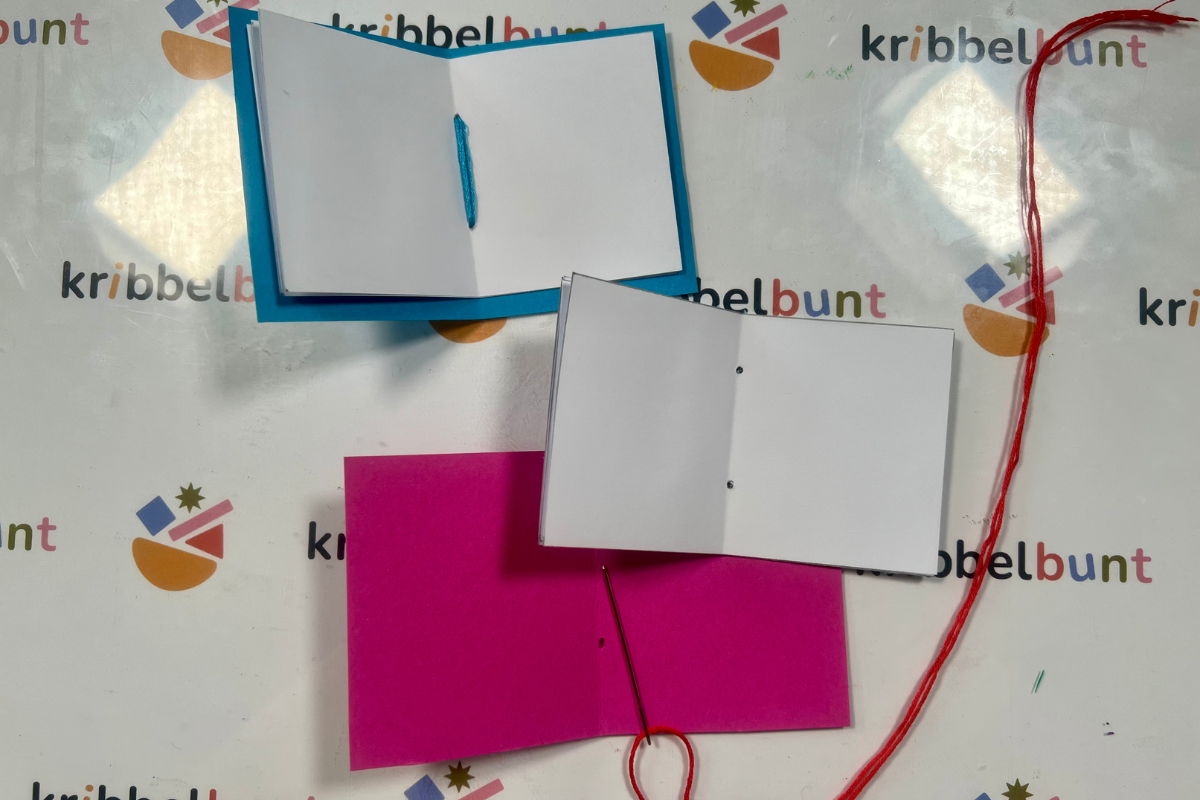 - Jetzt wird alles zusammengefügt: Mit der dicken Nadel stecht ihr zwei Löcher untereinander in die Falz von jedem Rechteck. Das Garn wird nun alles zusammenhalten. Führt dafür das Garn von innen durch die beiden Löcher durch, sodass ihr die Enden am Buchrücken miteinander verknoten könnt.