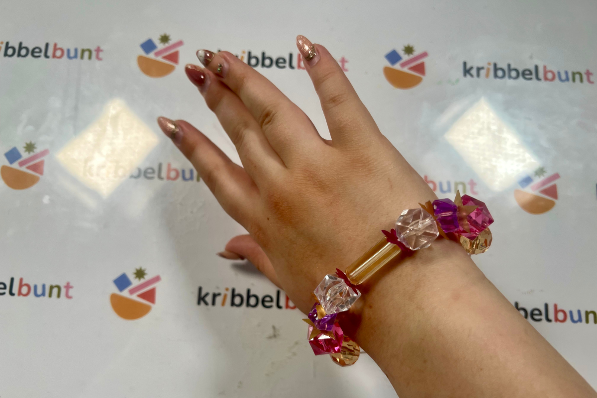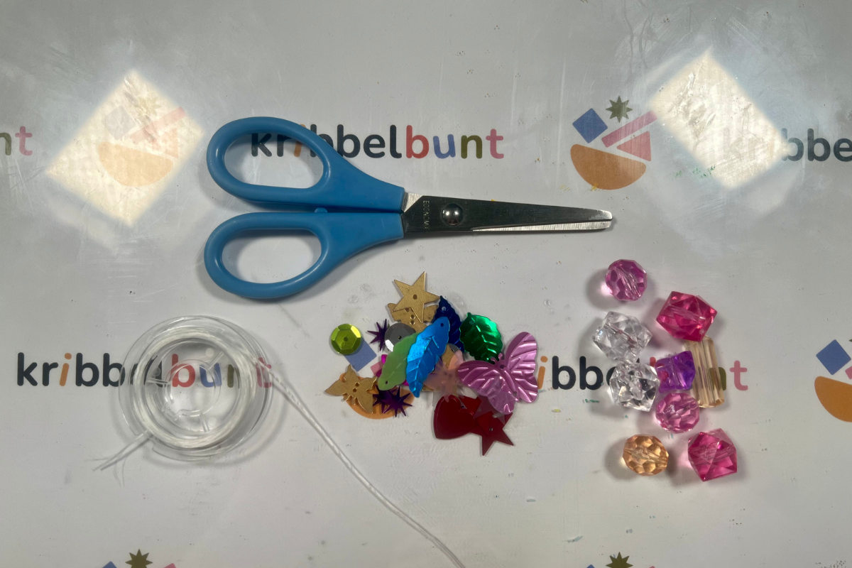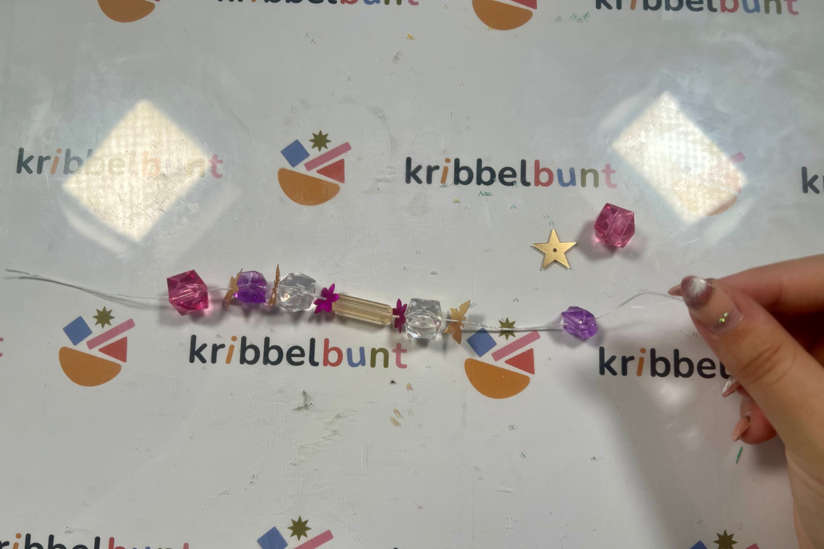 - Dann geht`s auch schon ans Fädeln. Nehmt eure Perlen und reiht sich so auf die Schnur, wie es euch gefällt. Hier ist eurer Kreativität keine Grenze gesetzt.