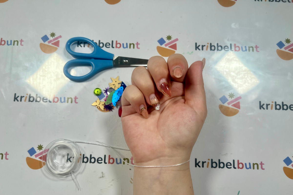 - Im ersten Schritt schneidet ihr eure Schnur so zurecht, dass sie später gut an eurem Arm sitzt. Lasst dafür ein paar Zentimeter zusätzlich.