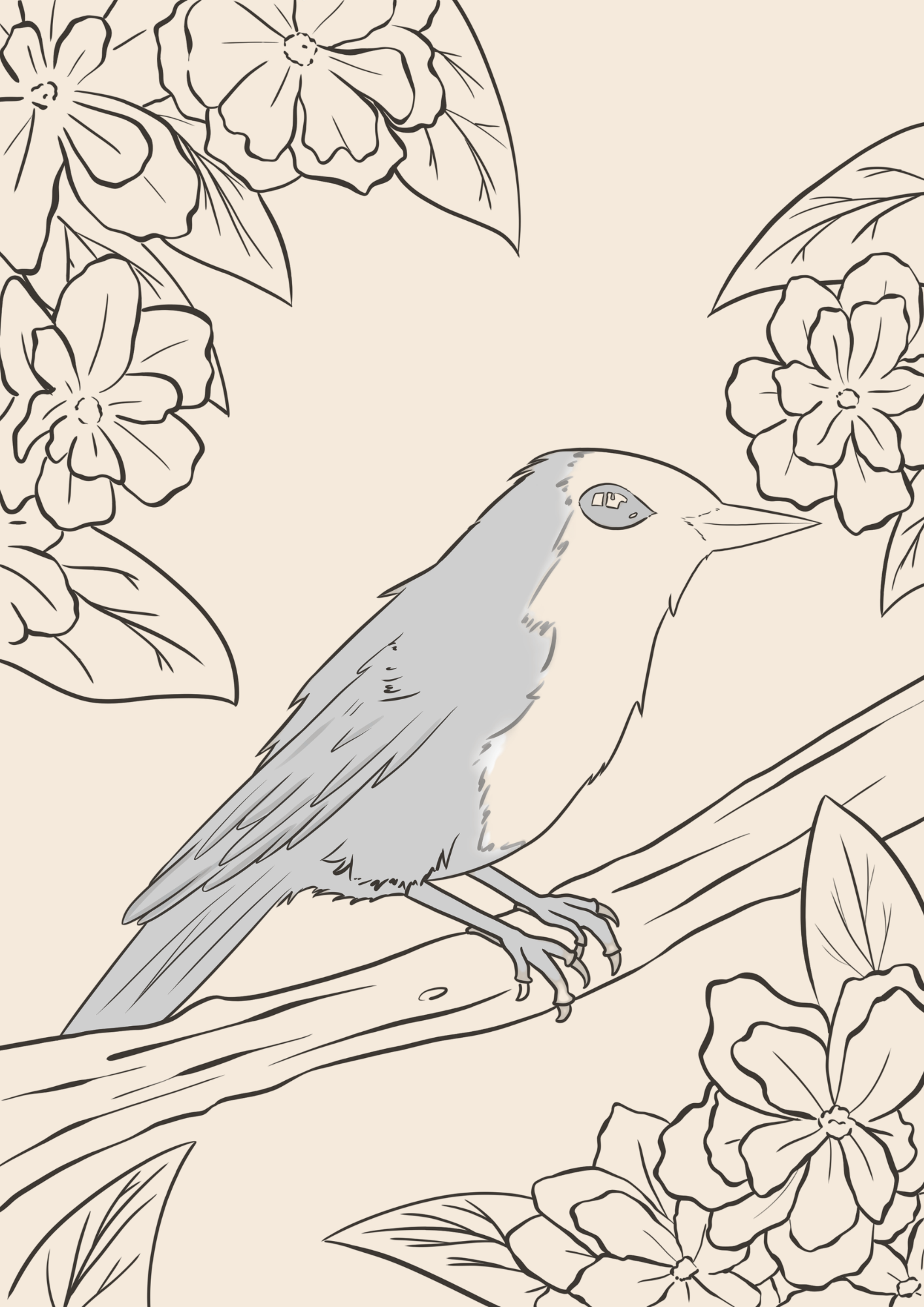 Ausmalbild Vogel und Blumen zum Ausdrucken als PDF.