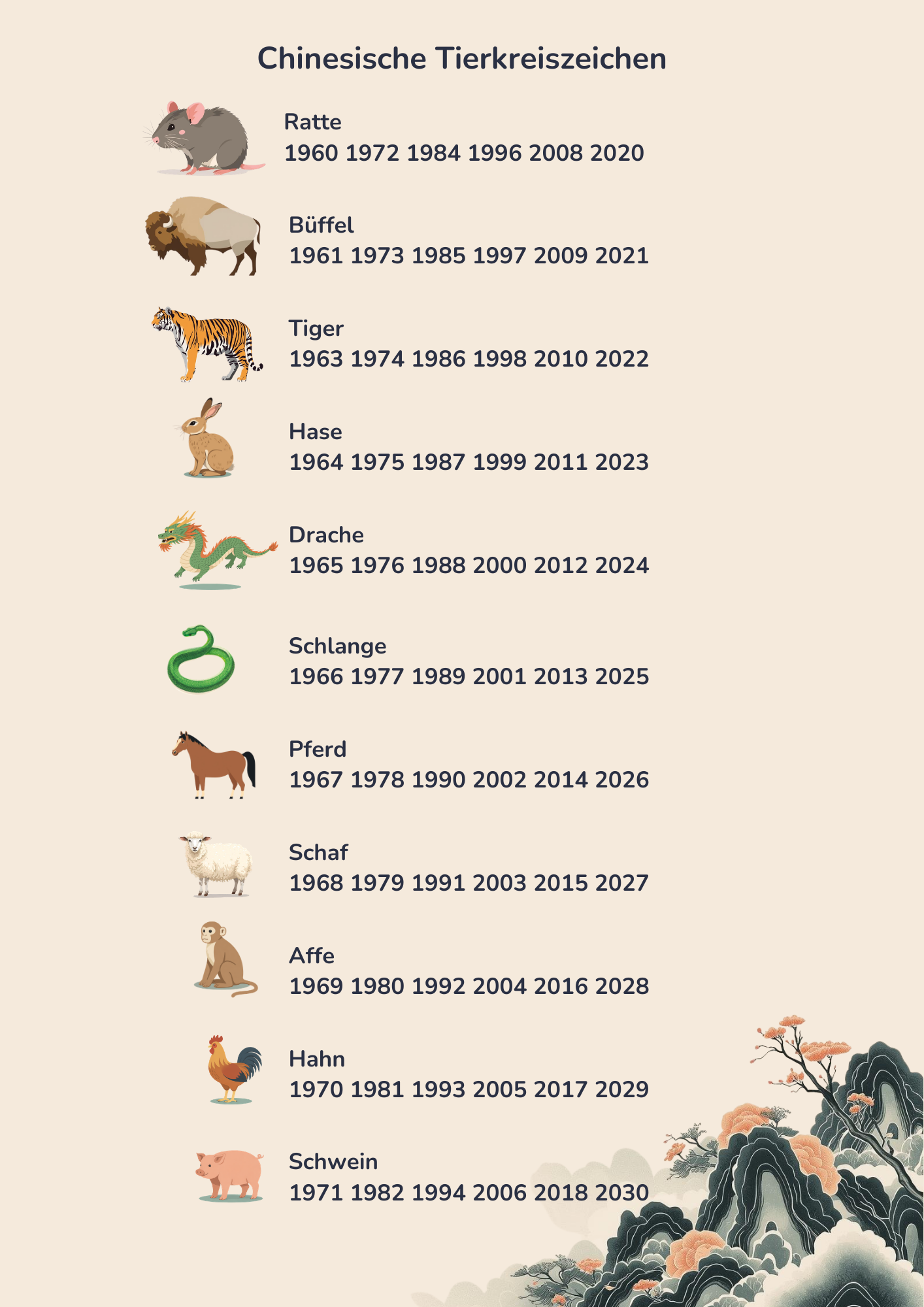 Welches chinesische Sternzeichen du hast, hängt also davon ab, in welchem Jahr du geboren wurdest. Jedes Jahr ist dabei einem bestimmten Tier zugeordnet, und nach zwölf Jahren beginnt der Zyklus erneut.