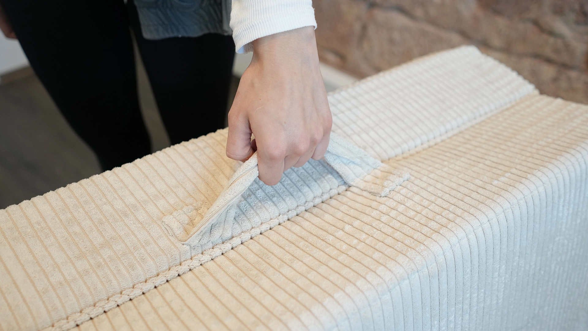 Der abnehmbare Cord-Bezug lässt sich wie beim Spielsofa waschen. Die Verarbeitung überzeugt auf ganzer Linie. Pet-Proof bedeutet hier: Tierhaare lassen sich leicht entfernen, der robuste Stoff hält auch Krallen stand. Die Farbauswahl reicht von dezentem Grau über cremiges Beige bis zu frischem Rosa.