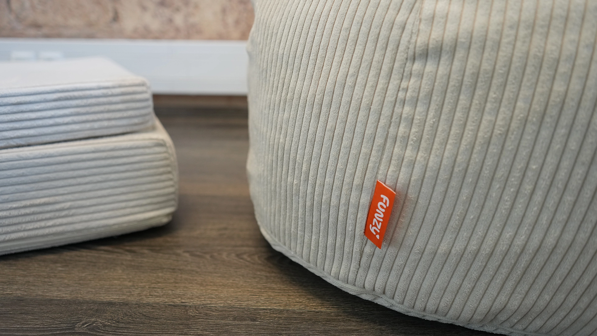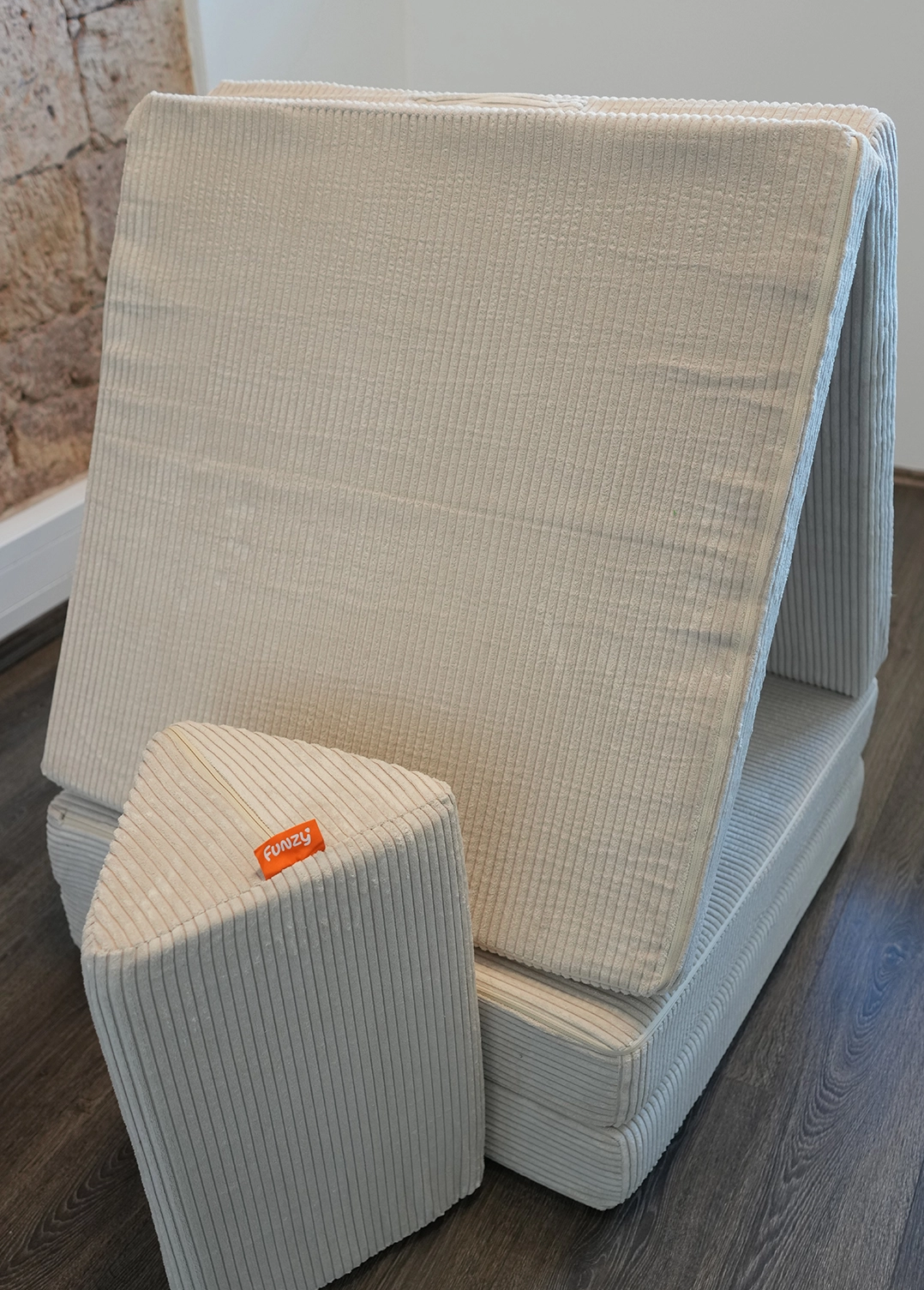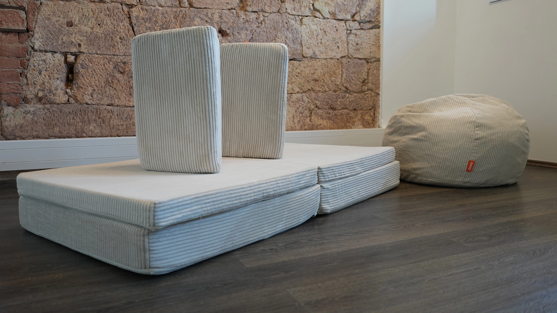 Der Funzy Sitzsack komplettiert das Spielsortiment. Mit etwa 85 mal 50 mal 50 Zentimetern und rund 7 Kilogramm wirkt er erstaunlich solide. Die Füllung besteht aus recyceltem Schaumstoff: Produktionsreste vom Spielsofa finden hier eine sinnvolle Verwendung. Upcycling statt Wegwerfen, ein sympathischer Ansatz.