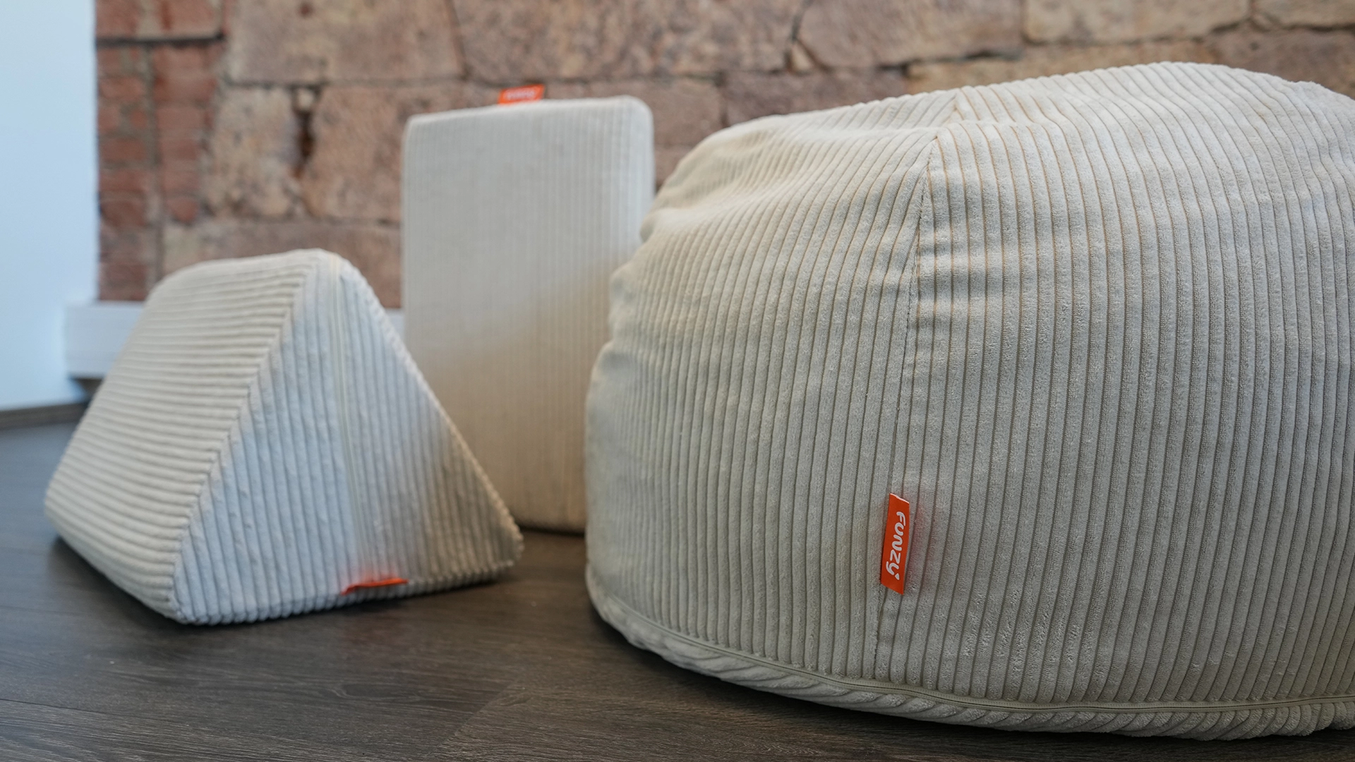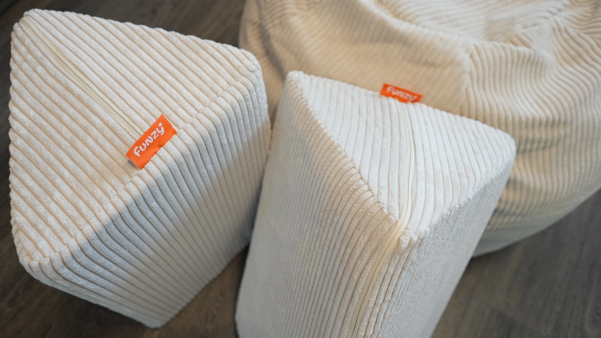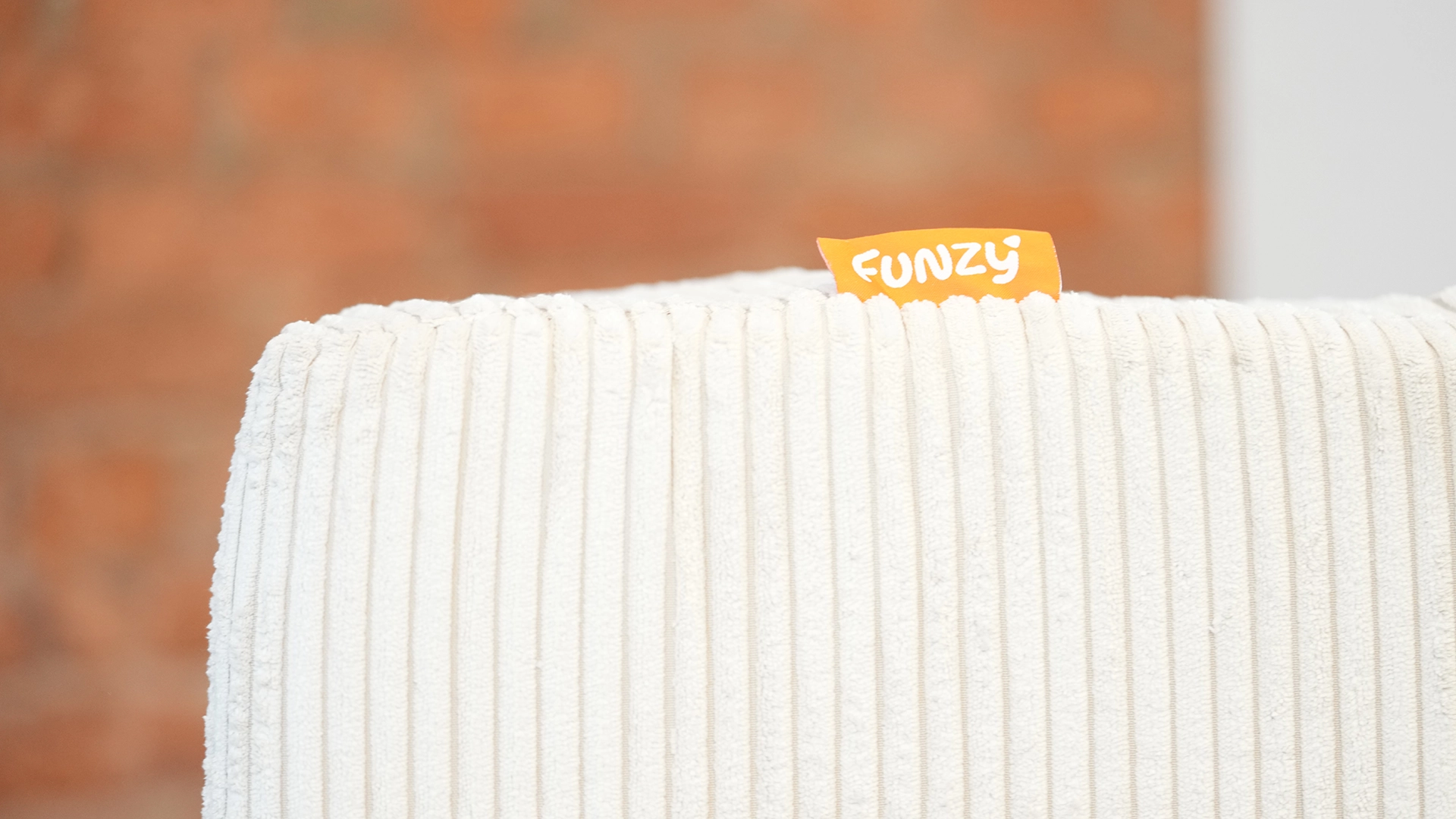 Der Funzy Sitzsack komplettiert das Spielsortiment. Mit etwa 85 mal 50 mal 50 Zentimetern und rund 7 Kilogramm wirkt er erstaunlich solide. Die Füllung besteht aus recyceltem Schaumstoff: Produktionsreste vom Spielsofa finden hier eine sinnvolle Verwendung. Upcycling statt Wegwerfen, ein sympathischer Ansatz.