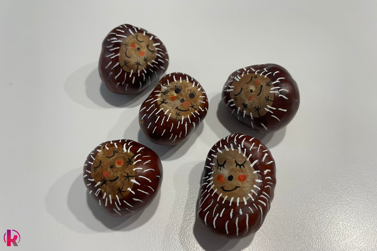 Jetzt wird`s noch kreativer. Mit Acrylstiften könnt ihr die Kastanien auch bemalen und z.B. kleine Igel basteln. Dafür braucht ihr: