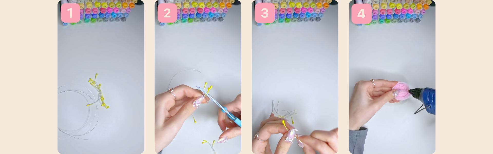 1. Ihr wickelt etwas Draht um die Blütenpollen damit die stabiler und sie Biegbar werden.