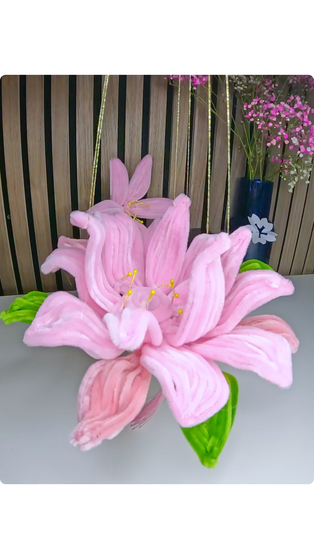 1. Als Letztes zieht ihr durch 3 der Blütenblätter Fäden und bindet ihn zusammen an einen Stab oder alternativ einem Stäbchen aus Holz fest.