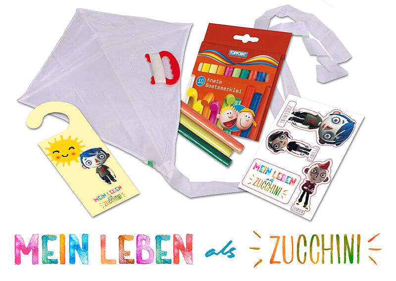 Zu gewinnen gibt es 3 "Mein Leben als Zucchini"-Fanpakete bestehend aus je einem Drachen, bunter Knete, einem Aufkleber sowie einem coolen Türhänger!