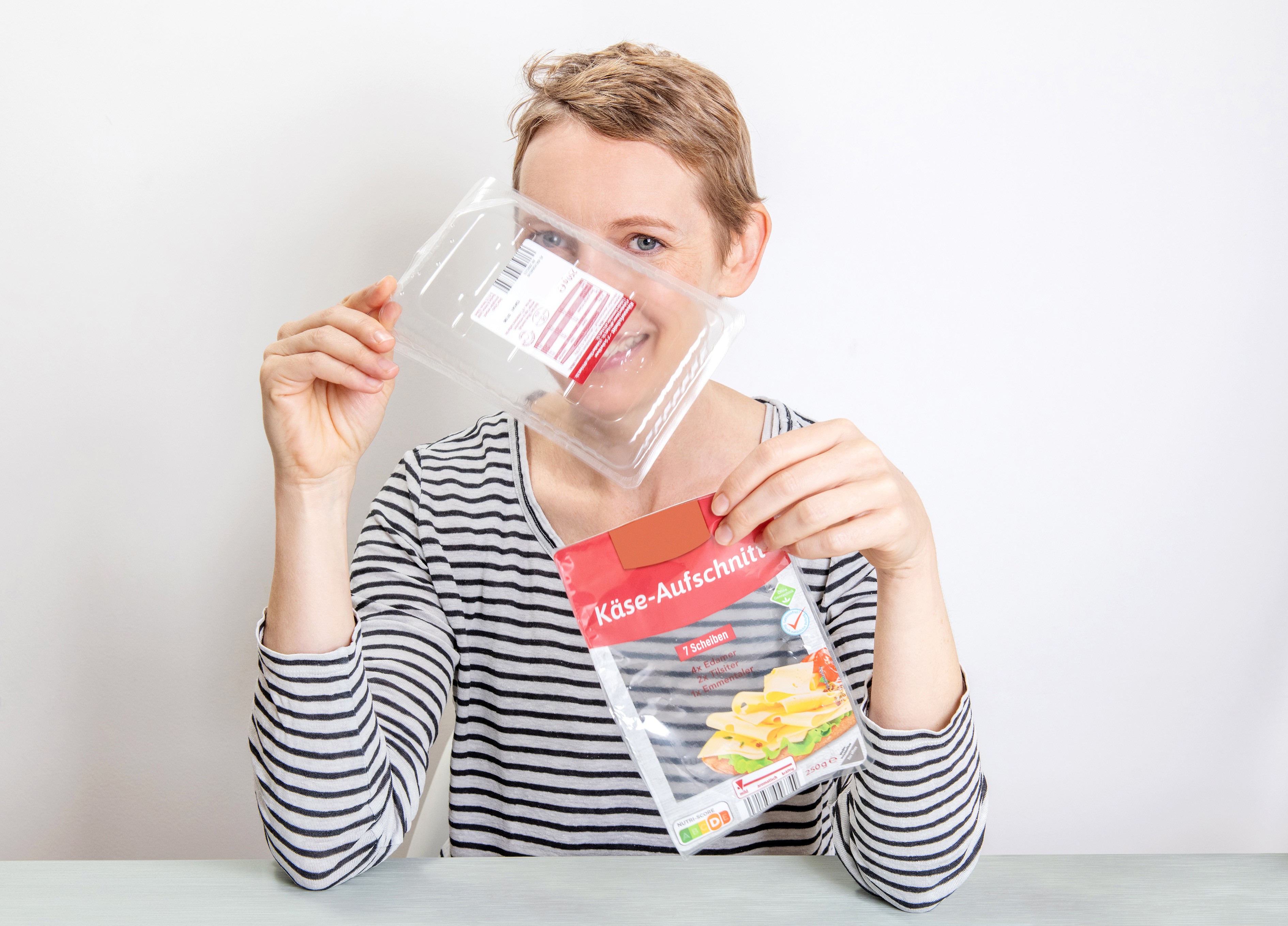 Verpackungen bestehen oft aus unterschiedlichem Material: Bitte Verpackung, Folien und Deckel getrennt voneinander in die Gelbe Tonne/den Gelben Sack einwerfen. So können sie von der Sortieranlage sortenrein erfasst und besser recycelt werden.