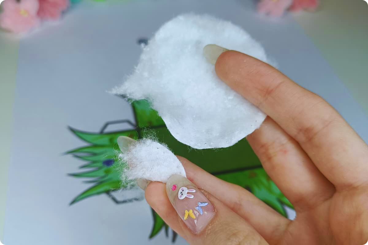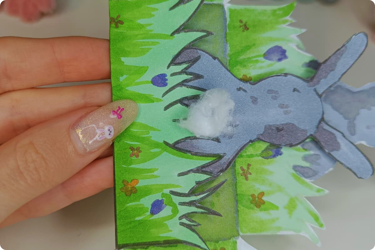 Jetzt nimmst du dir ein Wattepad (oder Watte) und zerrupfst es, diese Watte wird zum Hasenschwanz.