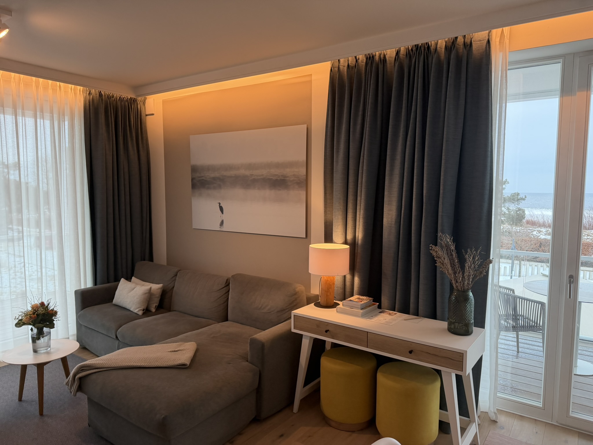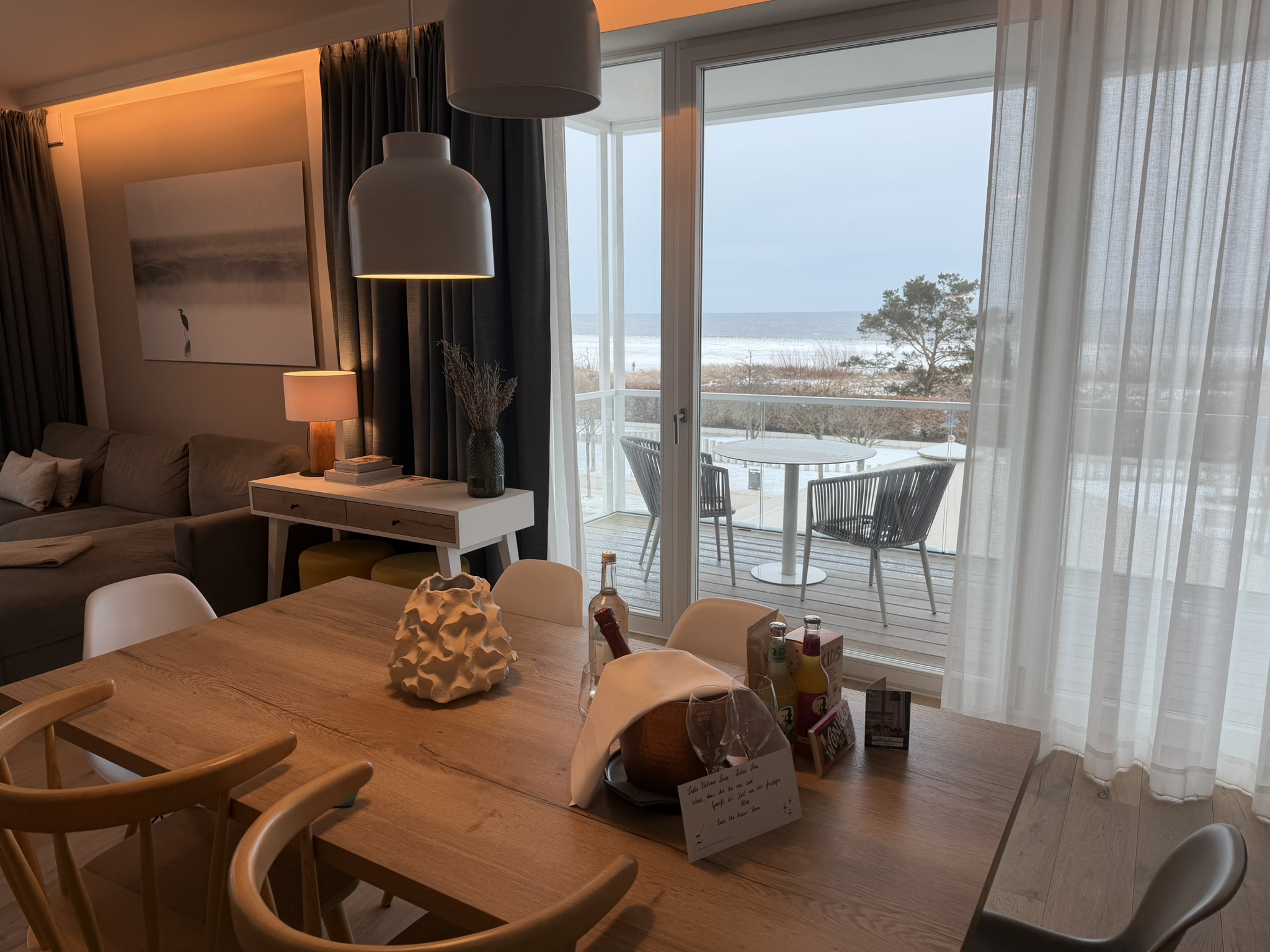 Hygge-Faktor: Während draußen die Brise weht, sorgt der Kamin im Wohnzimmer für wohlige Atmosphäre. Zwei Balkone bieten zudem den privaten Logenplatz am Meer.