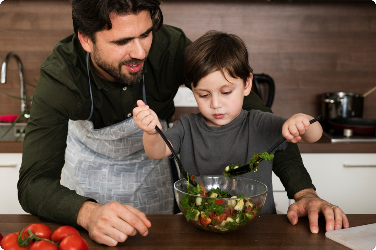 Es klingt paradox, aber Kinder einzubeziehen kann Zeit sparen, zumindest langfristig gesehen. Wenn die Kleinen beim Waschen von Salat oder dem Decken des Tisches helfen, sind sie beschäftigt und lernen wichtige Fähigkeiten. In der Zwischenzeit könnt ihr euch auf die komplexeren Schritte konzentrieren, ohne ständig unterbrochen zu werden.