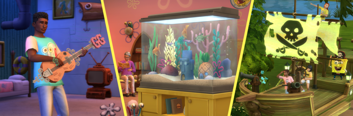 Ahoi! Die Sims 4 besucht Bikini Bottoms beliebteste Bewohner:innen in den neuen Sets Die Sims 4 SpongeBobs Haus und Die Sims 4 SpongeBobs-Kinderzimmer. Entdeckt neue Möbel, Outfits, Accessoires und vieles mehr – ganz im Stil von SpongeBobs bunter Unterwasserwelt.